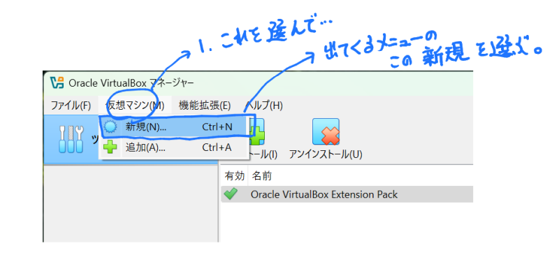 まず、下図のようにして VirtualBox の新しいシステム登録を開始する.