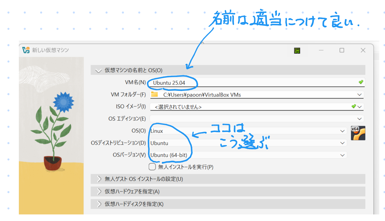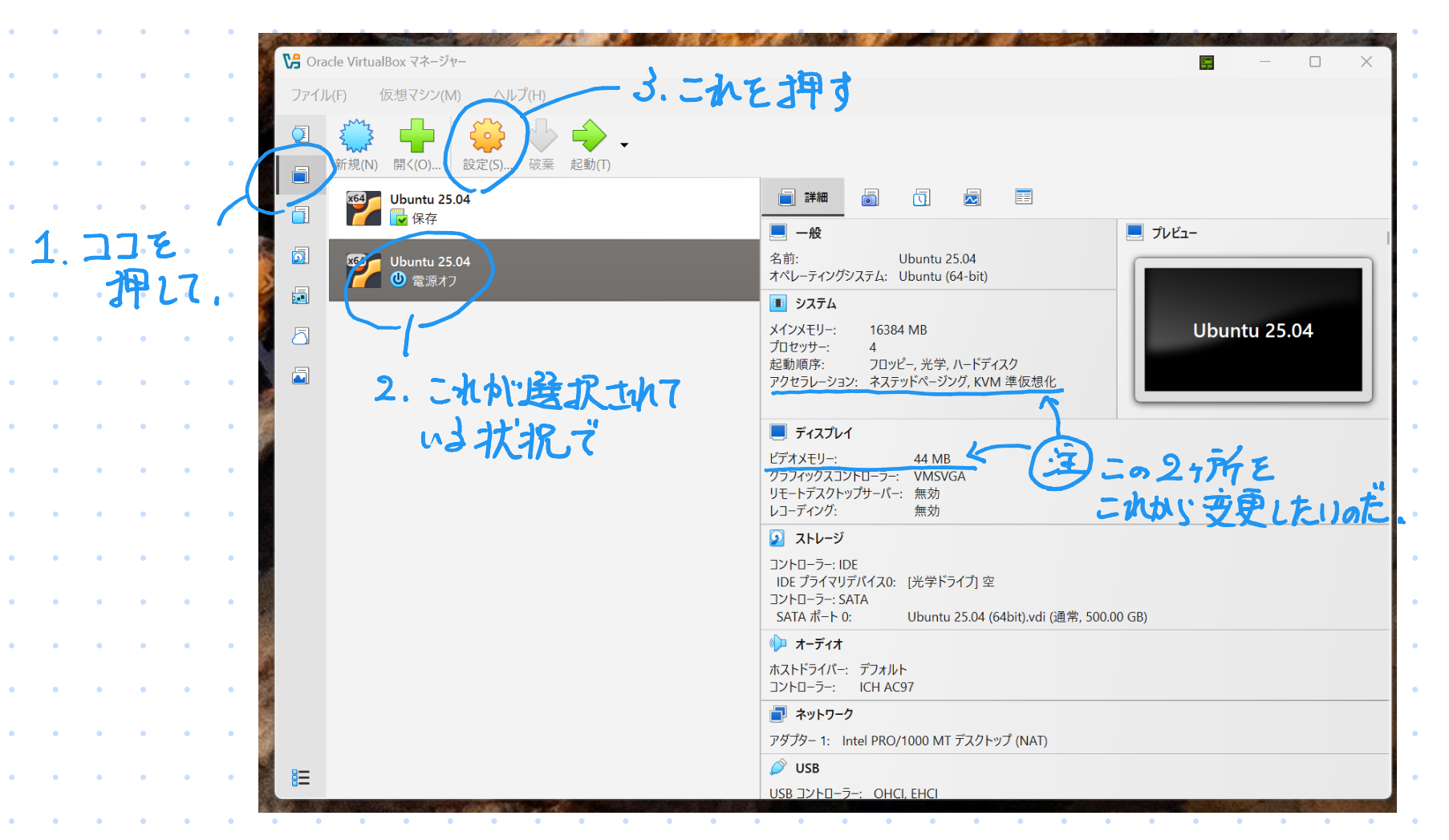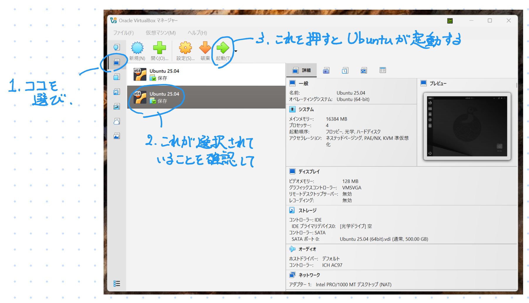 そこで、VirtualBox で下図のように操作すれば Ubuntu が起動する.