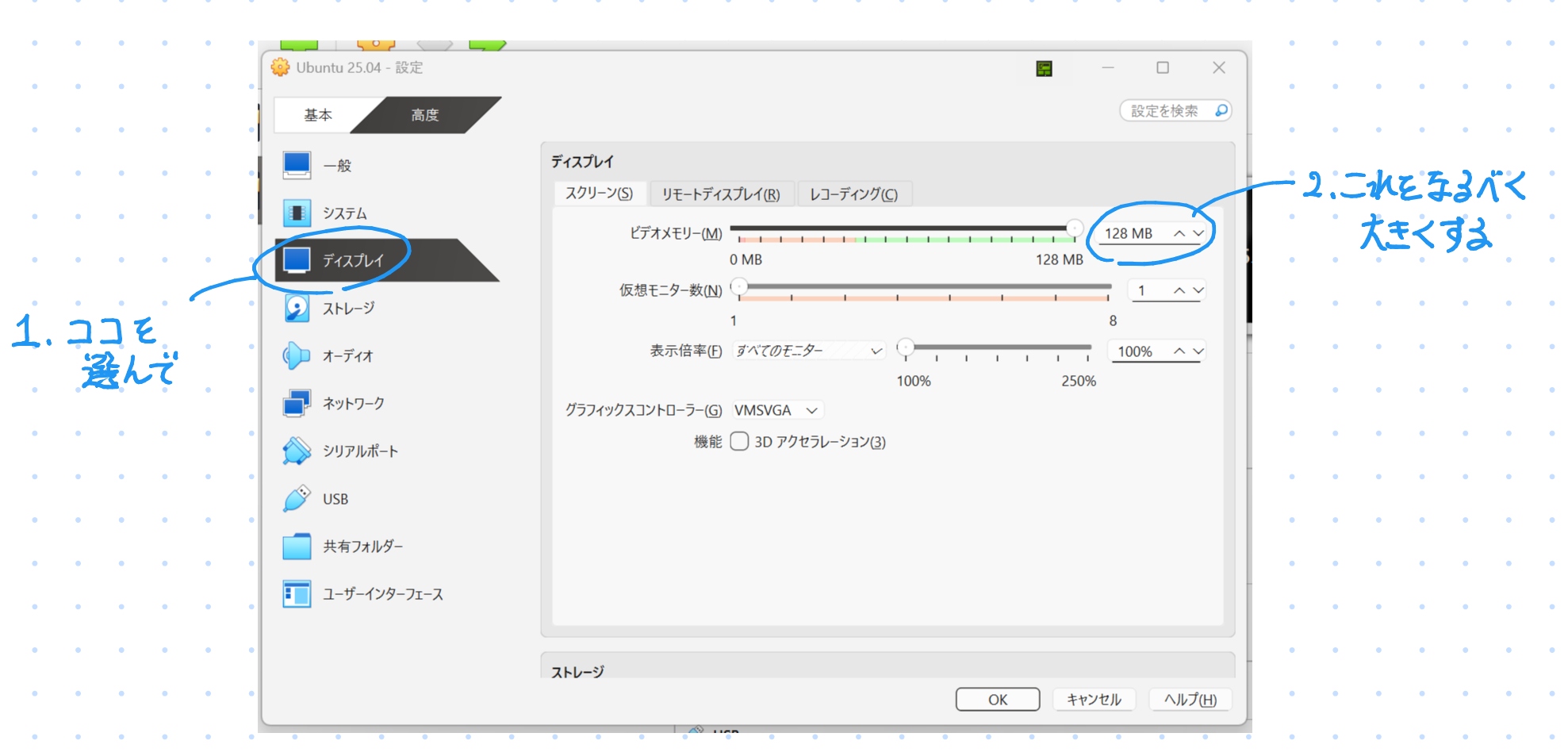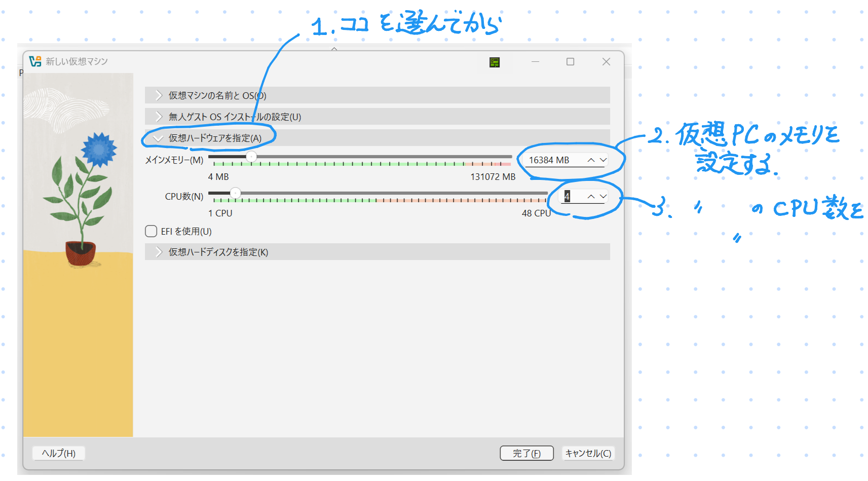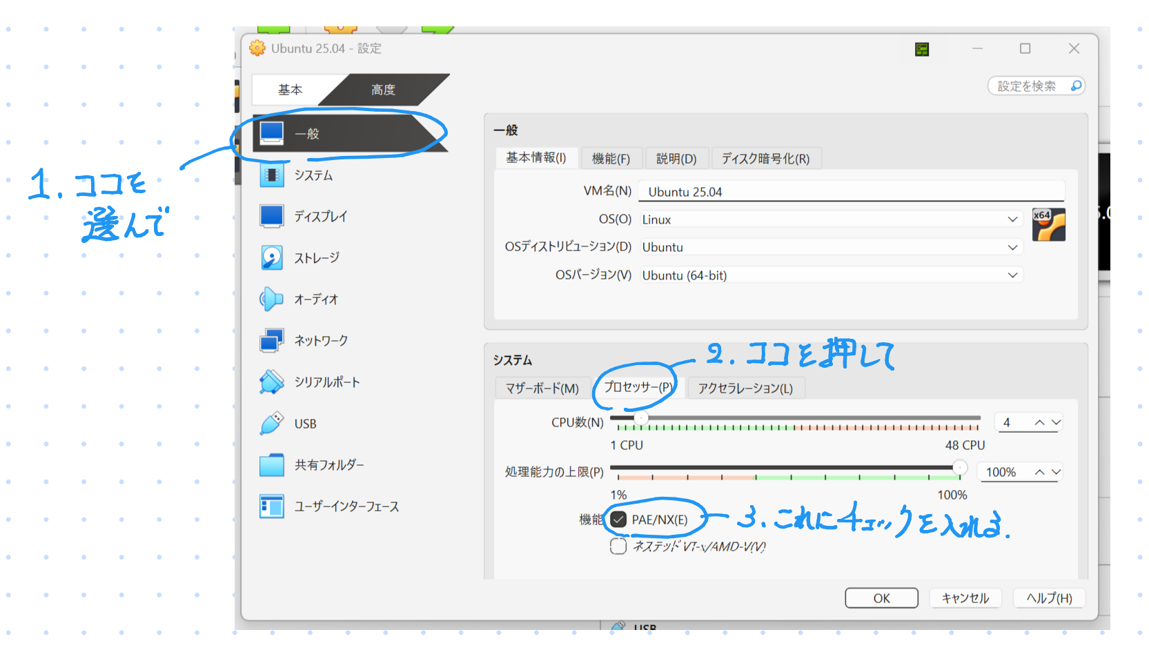 メモリもCPUも数字が大きいほど仮想PCの性能が上がるが、そのぶん VirtualBox が動いている「おおもとのPCのメモリとCPUを食う」ので、バランスを考える必要がある.