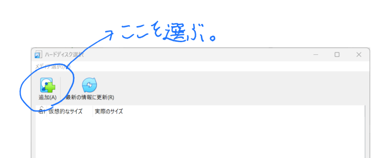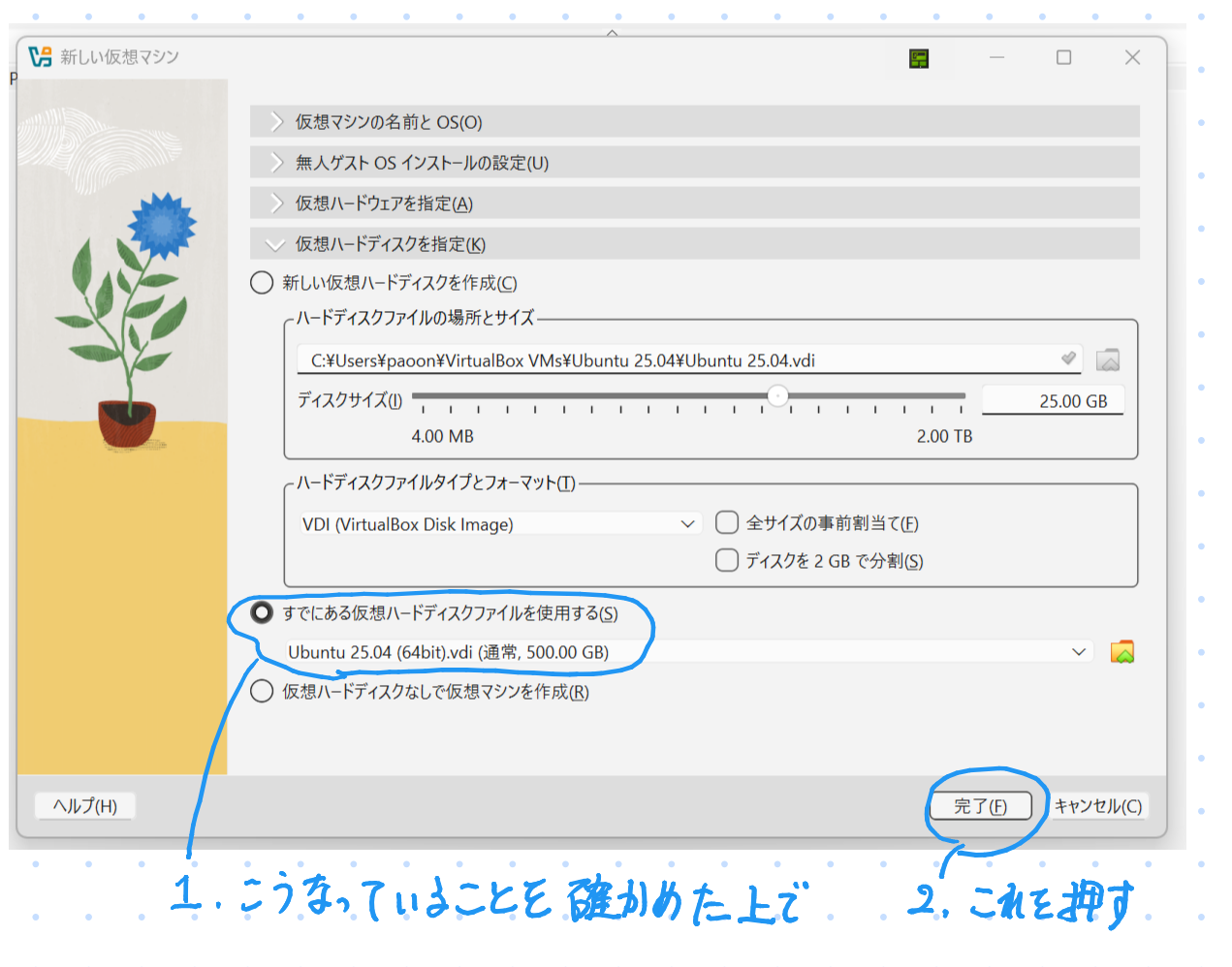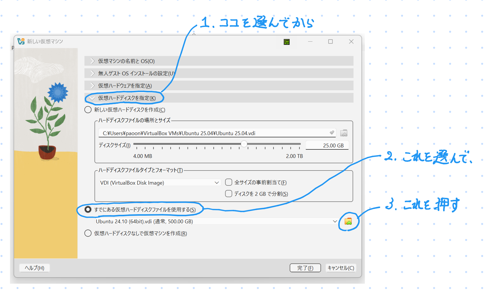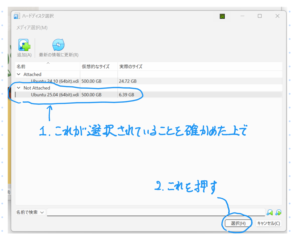でてきたファイル選択画面で、さきほどダウンロード & 解凍して得られたファイル "Ubuntu 25.04 (64bit).vdi" を指定する.